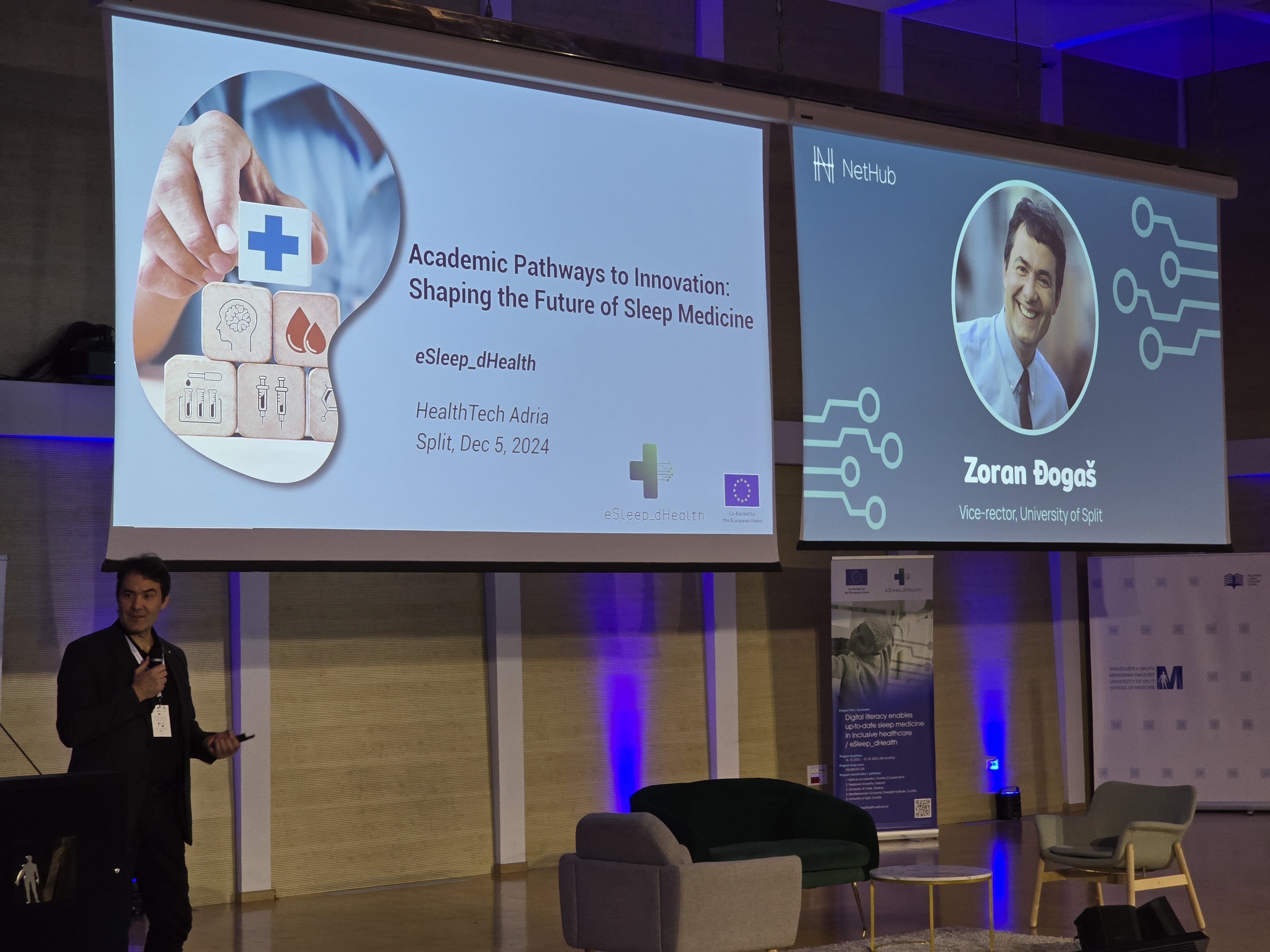 A major highlight of the conference was the keynote presentation by Zoran Đogaš, professor and vice-rector at the University of Split. In his lecture titled Why sleep medicine matters?, Đogaš delved into the critical role of sleep medicine in improving public health. He discussed the prevalence of sleep disorders, including sleep apnea, insomnia, and circadian rhythm disturbances, and their significant impact on health outcomes. Đogaš emphasized the link between sleep disorders and conditions such as cardiovascular diseases, type 2 diabetes, depression, and cognitive decline. He highlighted the goals of the eSleep_dHealth project in transforming sleep diagnostics by bringing advanced solutions from hospitals to patients’ homes through participatory healthcare and personalized treatments.